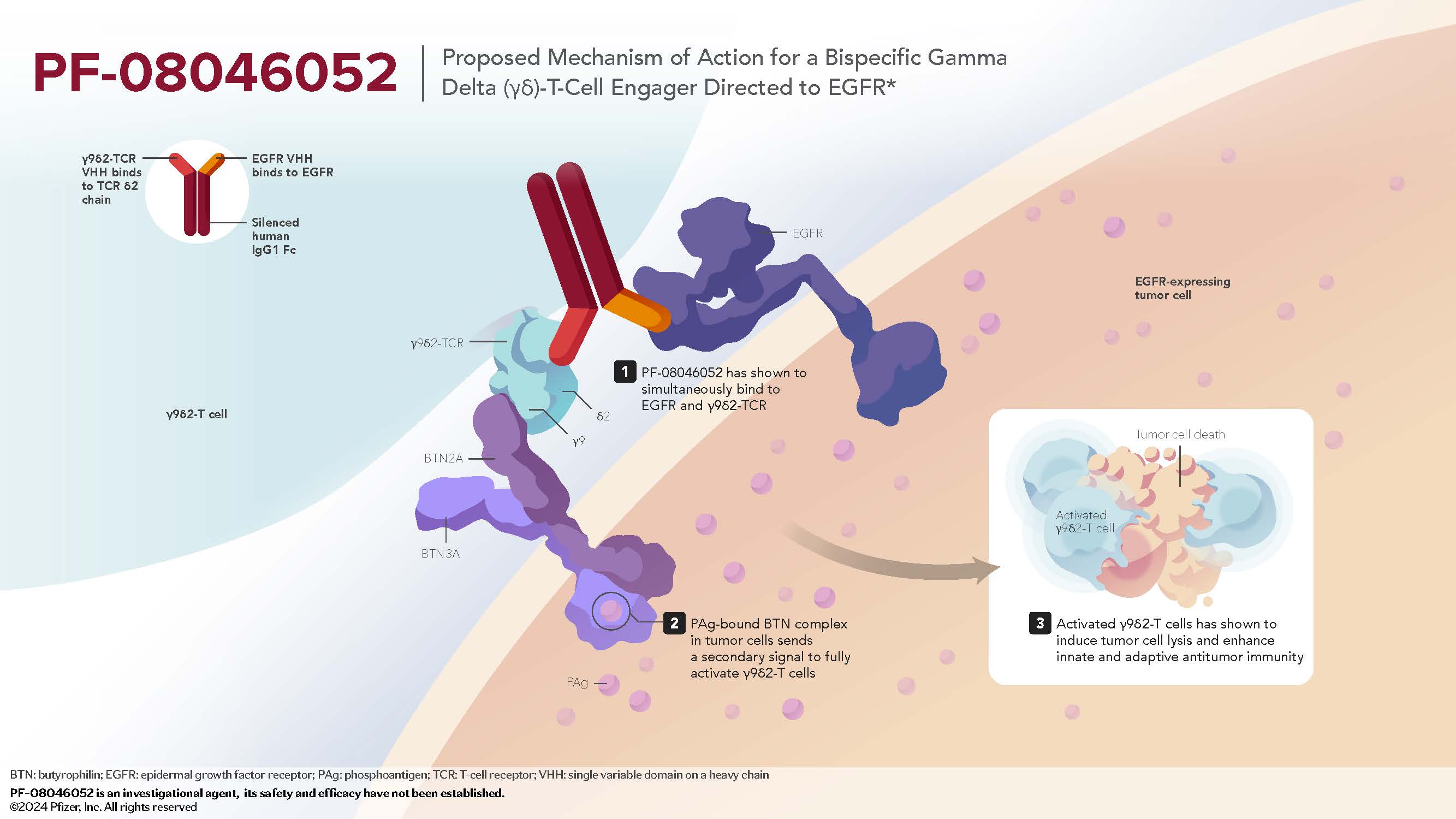 - PF-08046052 is a novel, investigational bispecific gamma delta (γδ)-T cell engager directed to EGFR, comprising a bispecific humanized heavy chain-only antibody designed to conditionally activate γ9δ2-T cells by simultaneously binding EGFR and γ9δ2 TCR.6